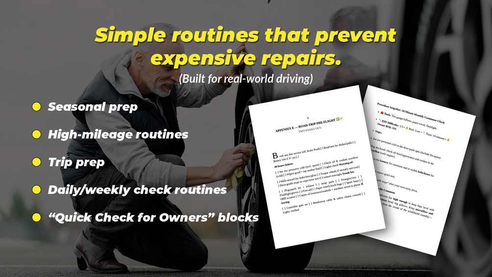 This 337-page guide teaches you the mechanical logic behind reliable, affordable car ownership, so you can stay confident, organized, and in control — whether you do your own maintenance or rely on a shop.